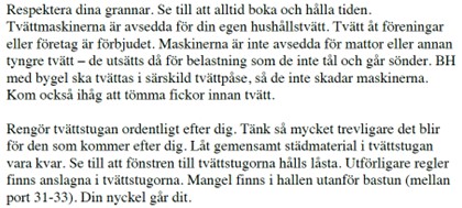 Tvättstugan är en gemensam tillgång. Den person, som har bokat en tid, har rätt att förvänta sig en städad, tömd och ordnad tvättstuga. Man ska inte behöva städa eller plocka undan efter andra som använt tvättstugan.